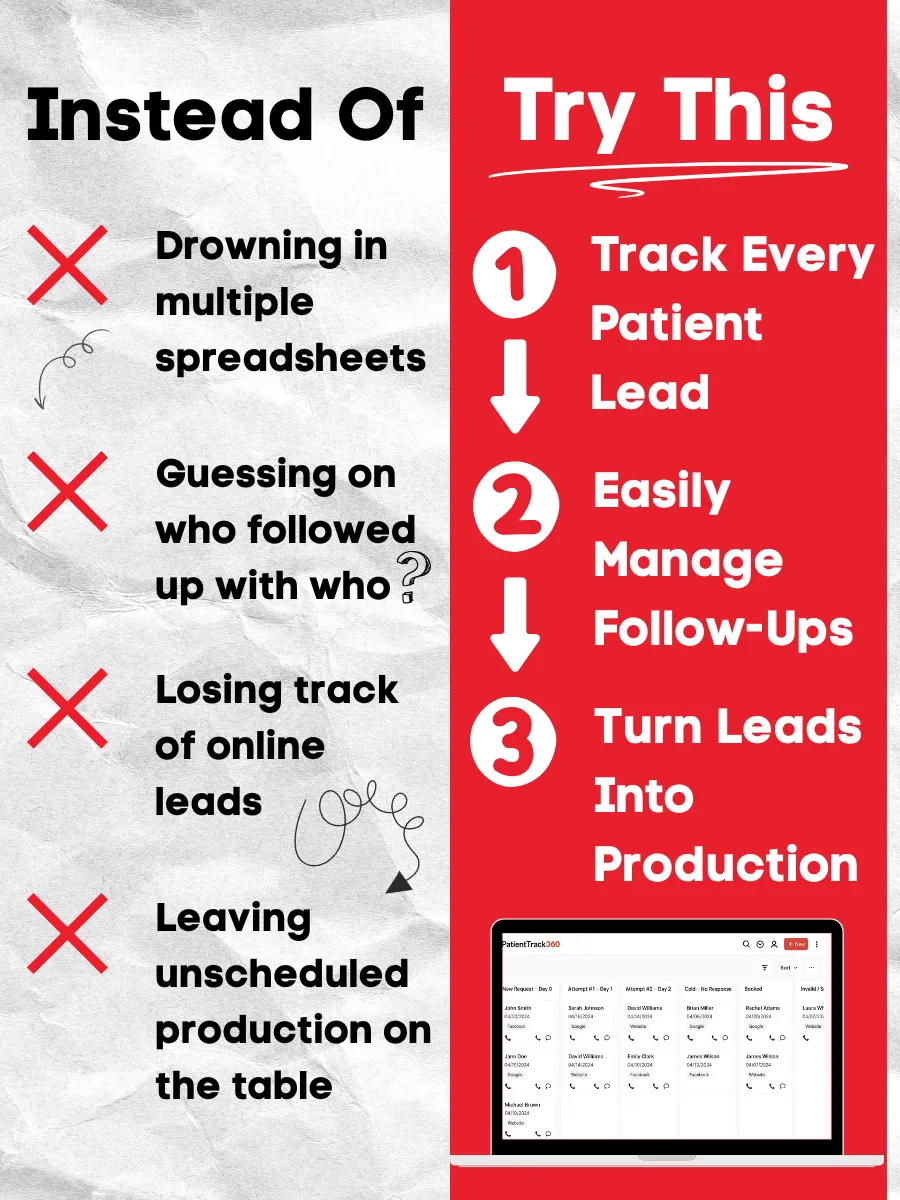 Our PatientTrack 360 technology turns every online lead into a tracked, followed-up, and booked appointment—so no patient slips through the cracks, and no ad dollars go to waste.